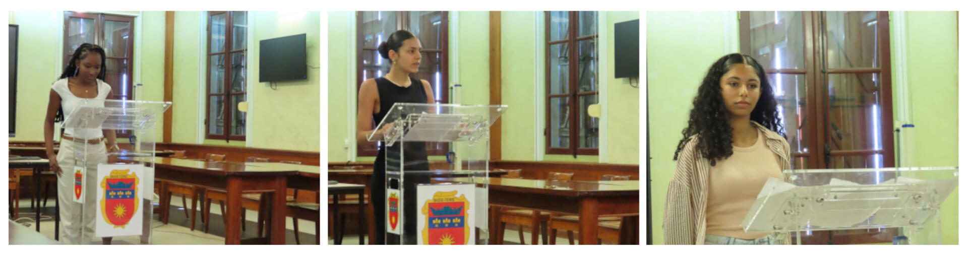 Après le mot de bienvenue d’André Atallah, Maire de Basse-Terre. puis les discours encourageants de Faïka et Chelsy (marraines de l’édition), les 8 élèves et les 3 étudiants finalistes se sont lancés dans la bataille de l’éloquence.