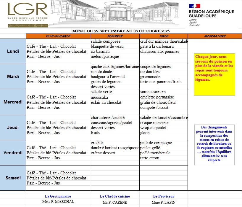 Nous vous invitons à découvrir chaque semaine les menus proposés pour le petit-déjeuner, le déjeuner et le diner.