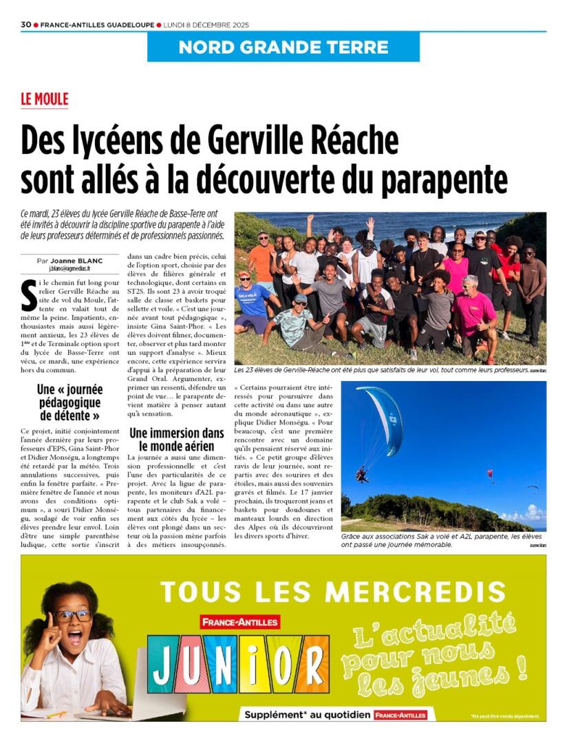 Mardi 2 décembre, les 23 élèves de Première et Terminale option EPS (Éducation physique et sportive) se sont rendus au Moule avec leurs enseignants, Mme Saint-Phor et M. Monségu, pour découvrir une nouvelle pratique sportive à leur arc, le parapente.